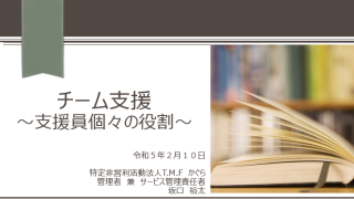 お知らせ 外部講師 宮若市で障がい福祉サービスを運営する法人の職員研修が、直方市中央公民館で開催され、今回ご縁があり講師として参加させて頂きました。講座は『チーム支援~支援員個々の役割~』というテーマで、これまでの僕の経験や、個々・チームで実践してきたことをお... 2023.02.24 お知らせ